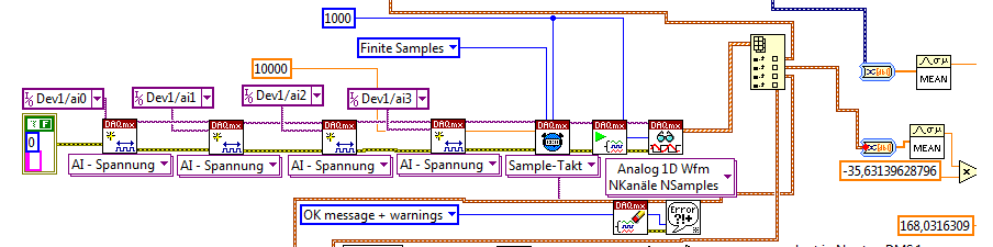 Ich habe nun mein VI vereinfacht und stelle es hier online. Bitte beachtet, dass die Umsetzung mit Min/Max nur beim Graph 2 erzeugt werden soll (der Obere). Die ExpressVIs "Signal sumulieren" stellen eigentlich die Messkarte da. Damit ihr seht, wie meine Messkarte angesteuert wird hänge ich noch ein Bild an.Irgendwie erhalte ich nicht das gewünschte Ergebnis, wie es in den VIs von Lucki und Jens G gezeigt worden ist. Wäre also nochmal dankbar, wenn Ihr mir helfen könntet, ich schaff es leider nichtSad