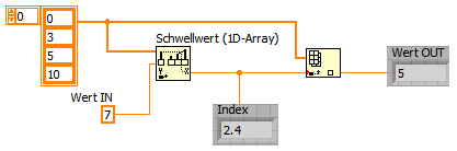 Siehe Beispiel. Der Wert ist 7, im Array gibt es die Werte 5 (Index2) und 10 (Index 3). Es wird der interpolierte Index 2.4 ausgegeben. Wénn man das an "Index Array" anschließt, wird auf 2 gerundet und der gewünschte Wert 5 ausgegeben.