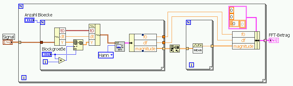 Aussage 1) ist falsch, denn so eine Vorgehensweise der Mittelung hätte eine Reduktion der Datenmenge und damit eine Reduktion der Auflösung des Spektrums zur Folge. Dem ist aber nicht so. Schickt man 64 Samples rein kommt ein Spektrum mit 32 Werten heraus. Wie erwartet. Hätte man (ich) auch früher drauf kommen können. Diese VIs mitteln also nur dann, wenn sie auch kontinuierlich mit Signalblöcken gefüttert werden.