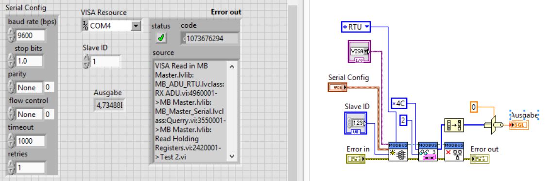 OK, die habe ich gerade nicht auf meinem System installiert. Aber auch dort sollte es ein VI geben, mit dem du entweder Input oder Holding Register lesen kannst. Um die Netzspannung abzufragen, musst du ab Adresse 76 zwei Register abfragen, die beiden Register dann tauschen und in dein Float typecasten, ungefähr so: