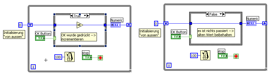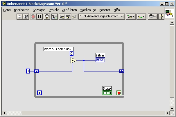 Programmiere das Bsp 1+2 mal nach und setz es irgendwo als SubVI ein, du wirst sehen, das VI "merkt" sich seinen Zustand und zählt den Wert hoch, bis es neu initialisiert wird.