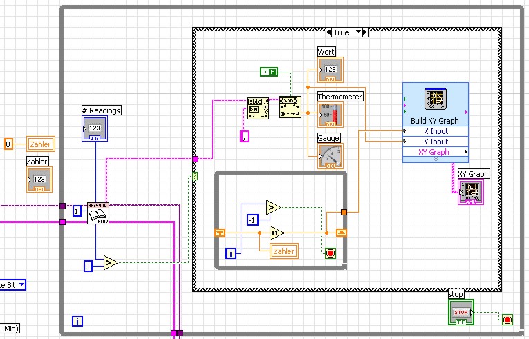 Ich lese Messwerte von einem Gerät ein (Read VI). Dabei verfügt das Gerät selbst über einen Speicher für eine gewisse Anzahl Werte. Beim Aufruf der besagten VI liefert mir das Gerät nicht nur den aktuellen Messwert sondern auch die Anzahl der bis diesem Zeitpunkt eingelesenen Werte. Da die PC Datenverarbeitung schneller läuft als die Messwerterfassung am Gerät muss ich erst warten bis ein Wert vorliegt. Ist dies der Fall so läuft eine Case-Struktur an, die die Werte ausgibt. Würde ich hier nicht so vorgehen würde ich ständig Lücken in meinem Messwertdiagramm erhalten. Allerdings soll noch die Anzahl der (auf dem PC) erfassten Werte gezählt werden. Hierzu wollte ich den von der Read VI ausgegebenen Wert (sollte meist nur 1 sein) aufsummieren. Die abgebildete Variante mit der While Schleife innerhalb der Case-Struktur funktioniert zwar, allerdings ist ja die Benutzung von Variablen nicht so gern gesehen. Daher würden mich andere, vor allem simplere Lösungen interessieren.