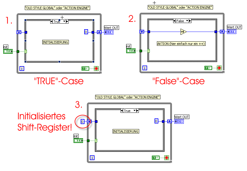 Wenn der Wert des Shift-Registers bei jeden Aufruf des VIs neu "genullt" werden soll, dann initialisiert man ihn von aussen. (Siehe Bsp. 3)