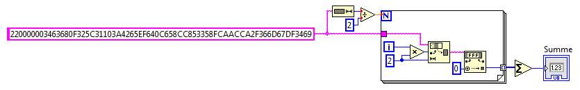 also, mal zur Ansicht (siehe Anhang), die Schleifenlösung ist schon was langsames, mein "Nichtschleifenansatz" ist zwei- bis dreimal schneller. Parallelisierung ist natürlich ein Ansatz, da ich aber nicht genau weiß wie viele S-Records es sind muss man sicher einigen Gehirnschmalz in die "Verteilung" stecken. Ich hatte gehofft durch eine geschickte Transformation des Strings ein Array aus zwei-Zeichen-Strings zu erzeugen, welches ich dann auf die Funktion Hex-String-nach-Zahl gebe und dieses wiederum auf Array addieren usw. Da ist man ja mit der Funktion Tabellen-String nach Array auch nah dran, nur leider gibts im S-Record kein Trennzeichen. Kann ich nicht irgenwie eine Formatierung vorgeben die LV dazu veranlasst immer zwei Zeichen in ein Array-Element zu packen ?