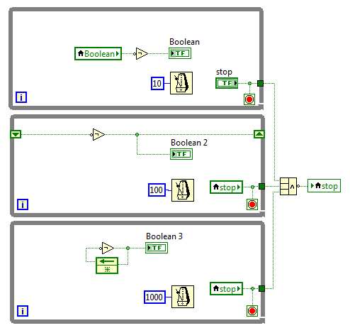 Wenn die 3 Schleifen alle im gleichen VI laufen. kann man das Stoppen der drei Schleifen einfach mit lokalen Variablen machen.
