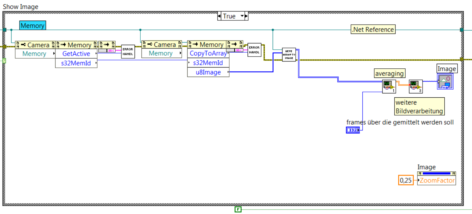 Mein Ansatz wäre jetzt, dass ich das Averaging-VI (VI siehe Anhang) auflöse und die for-Schleife um die "Memory Invoke-Node" oder sogar um die "Camera Invoke-Node" lege. Aus ersterer wird das u8Image ausgegeben und ich vermute, dass ich hier die Möglichkeit habe, mir die gewünschten N Bilder in die Zwischenablage zu speichern. Ich weiß allerdings nicht was es mit den Invoke-Nodes und der .NET-Reference auf sich hat (hab nur ein bissl gegooglet und eine kurze Zusammenfassung von Microsoft gelesen), ob ich richtig mit meinem Ansatz liege, und on-top, ob ich noch irgend etwas beachten muss. Vielleicht kann mir hier jemand helfen?