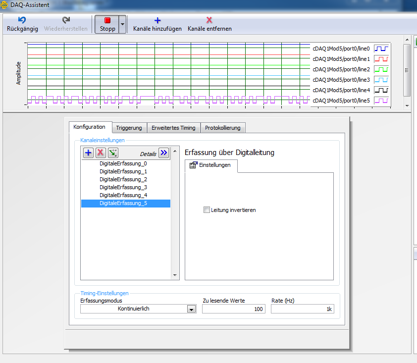 Ergänzung: Habe im Measurement & Automation Explorer das Testpanel aufgerufen. Wenn ich Start drücke, rührt sich leider nichts. Wenn ich das richtig verstanden habe, müssten alle Eingänge angesrochen werden (port0/line: port5). Ein Nachmessen an den 24V Ausgängen des Roboters, mit welchen das Modul verknüpft ist, hat ergeben, dass diese 26V liefern.