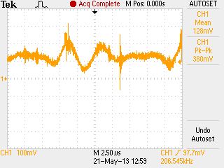 EDIT: Oszilloskop dauert noch, hier ein Screenshot der kontinuierlichen Erfassung am Eingang, welcher eigentlich auf FALSE sein müsste.