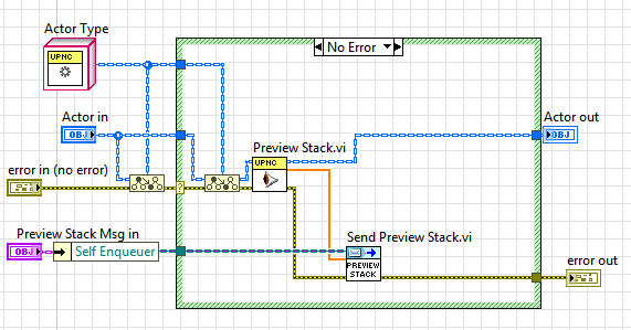 Im 'Preview Stack Msg.lvclass: Do.vi' soll der Stack an den Aufrufer zurück geschickt werden. Hierfür übergibt der Aufrufer seinen Self Enqueuer an die Methode 'Preview Stack Msg.lvclass: Send Preview Stack.vi'. Mir gefällt die Idee eine Referenz auf den Self Enqueuer des Nachrichtenaufrufers zu verwenden. Soweit ich das verstehe, wird es dadurch deutlich flexibler, da ansonsten nur der Aufrufer des Akteurs zu Verfügung stände, und das muss nicht der Sender der Nachricht sein.
