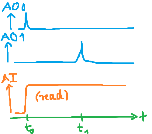 Die Karte soll zwei Geräte mit einem beliebig wählbaren Delay triggern, indem sie jeweils über die Ausgänge AO0 und AO1 einen Puls mit kürzest möglicher Dauer, als in diesem Fall wohl ~5µs, ausgibt.