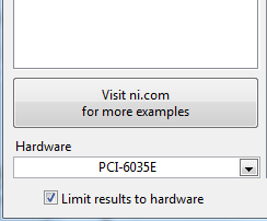 NI Example Finder starten, 6035E unter Hardware eintragen und Ergebnisse auf die Hardware einschränken.