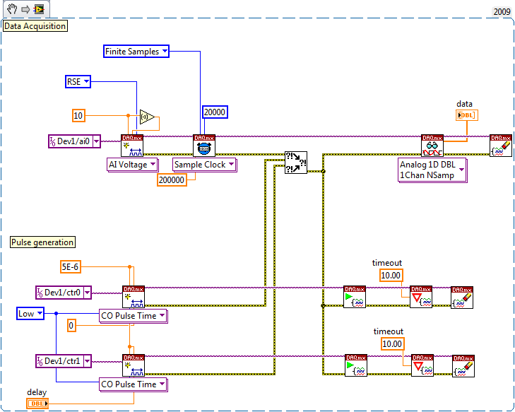 Das war etwas, was ich nicht verstanden habe, bzw. zu wenig Dokumentation gefunden habe. Die Default Outputs für die Counter sind "Ctr0Out" und '"Ctr1Out", beide können aber laut Whitepaper zum BNC-2090A Anschlussblock, den ich nutze, nicht ohne Rerouting mit der Außenwelt kommunizieren. Es sei denn, ich habe hier starke Verständnisschwierigkeiten. Und wenn ich beide rerouten will, meckert DAQmx, dass sich das gegenseitig ausschließt (wohl, weil ctr0out nur indirekt auf ein PFI über ctr1out geroutet werden kann - ich bin halb wahnsinnig geworden, beim verzweifelten und erfolglosen Versuch, das zum Laufen zu kriegen.
