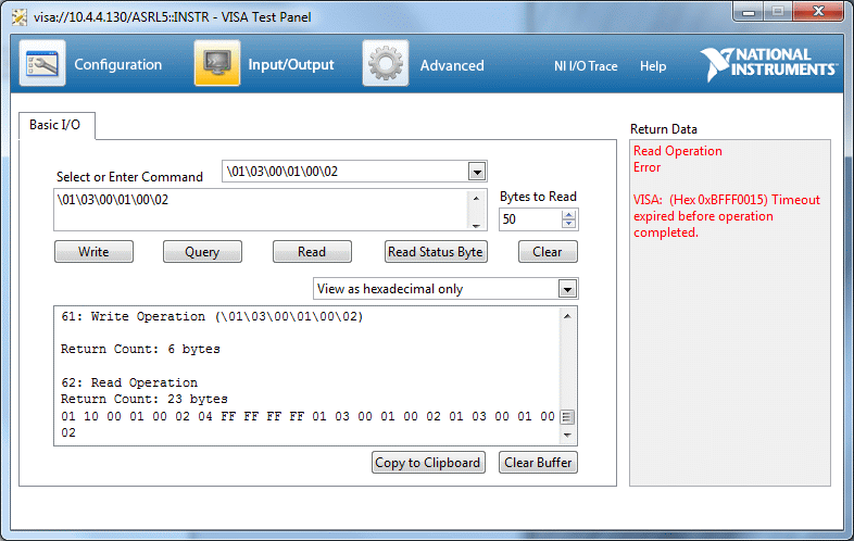 es liest und schreibt ohne Fehlermeldung im VISA test panel, aber die einzige Antwort ist, kein Fehler und die Anzahl gelesene Bytes. Geht mit und ohne Fehlercode.