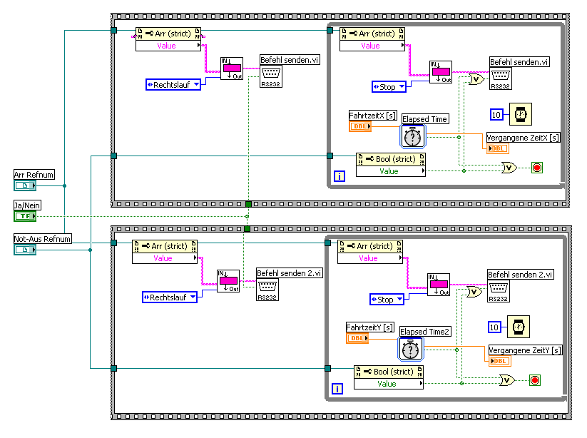 hab mal ein Test VI incl. SubVI gestrickt. Aus dem HP heraus sollen die Zeitwerte eingegeben werden (bzw. aus der Berechnung übernommen werden). Dann soll das SubVI loslegen, und wenn die Zeit um ist diese an das HP übergeben. Beim erstenmal klappts, beim zweiten mal nur der eine, beim dritten mal beide nicht, beim vierten funzt es wieder oder wie auch immer. Probiert´s mal aus, hoffe es läuft bei euch.