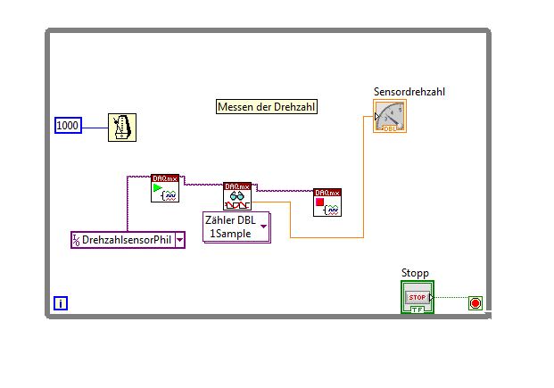 was mir direkt auffällt: Du hast keine Schleife um das ganze Programm, darum wird es beim Ausführen direkt wieder beendet. Zieh doch mal eine While-Schleife um alles herum, dann klick Rechts auf den Eingang vom roten Schleifenende und klicke auf Erstellen -> Bedienelement. Jetzt läuft dein Programm bis du den Knopf - der Stopp heißen sollte - drückst. Die Wartezeit im Case solltest du dann löschen können - ich weiß zumindest nicht ob die wichtig für dich ist, scheint mir aber nicht so - und du hast schon eine über der Drehzahlmessung, darum brauchst du in der neuen Schleife keine mehr einzufügen.