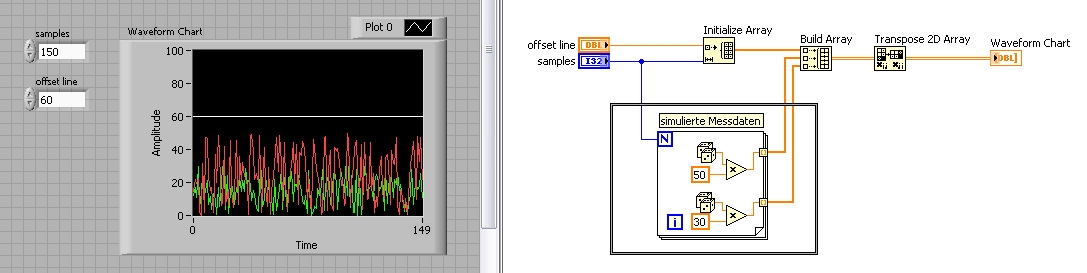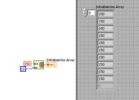 Vielleicht daran, dass wir in dem Bild nicht erkennen können, wo du was verdrahtet hast? Warum (scheinbar) die "150" nicht mit dem InitArray verbunden werden kann? Vielleicht würde es ja helfen, die in LV9 durchaus vorhandene Aufräum-Funktion fürs Blockdiagramm ab und zu mal zu benutzen, um zu erkennen, welcher Draht wo lang führt... (StyleGuide: von links nach rechts, gerade Drähte, etc.)