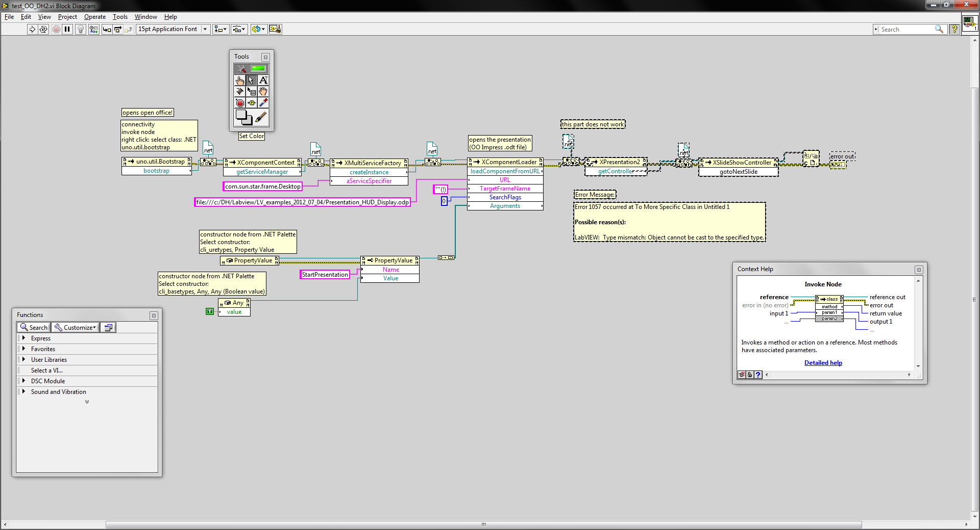 ich arbeite seit kurzem mit LabVIEW (Version 2011 SP1) und ich möchte eine Open Office Präsentation von LabView aus öffnen und steuern. Das heißt ich möchte, dass abhängig von einer Bedingung LabView die nächste Seite / Folie der Bildschirmpräsentation einstellt.
