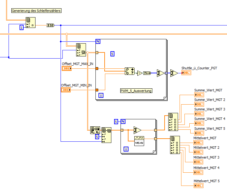 Im Zuge meiner Bachelorarbeit, baue ich eine Testanlage um. Diese Testanlage ist für ein Fördersystem. Auf diesem Fördersystem fahren Shuttle. Sie besteht aus verschiedenen Messeinrichtung und sammelt Werte über Zeitverhalten, Positioniergenauigkeit und Geschwindigkeitsdaten, der Shuttles, ein. Diese Messdaten werden von der Software SPS der Firma Beckhoff erkannt (bzw. vom den Buskopplerklemmen für die die es ganz genau nehmen) und an Labview übergeben. Nun schreibt Labview über das main.vi die Messwerte in ein Datenarray. Wenn der Shuttle nun eine gewisse Rundenzahl erreicht hat werden diese Messwerte (auf grundlage der Report Generation Toolkit for Office) in eine Excel- Tabelle geschrieben. In der Excel- Tabelle werden dann die Durchschnittswerte berechnet. Wie oft ein Fehler aufgetreten ist usw. (Sry muss es so beschreiben da meine Arbeit erst nach einreichtung veröffentlicht wird)