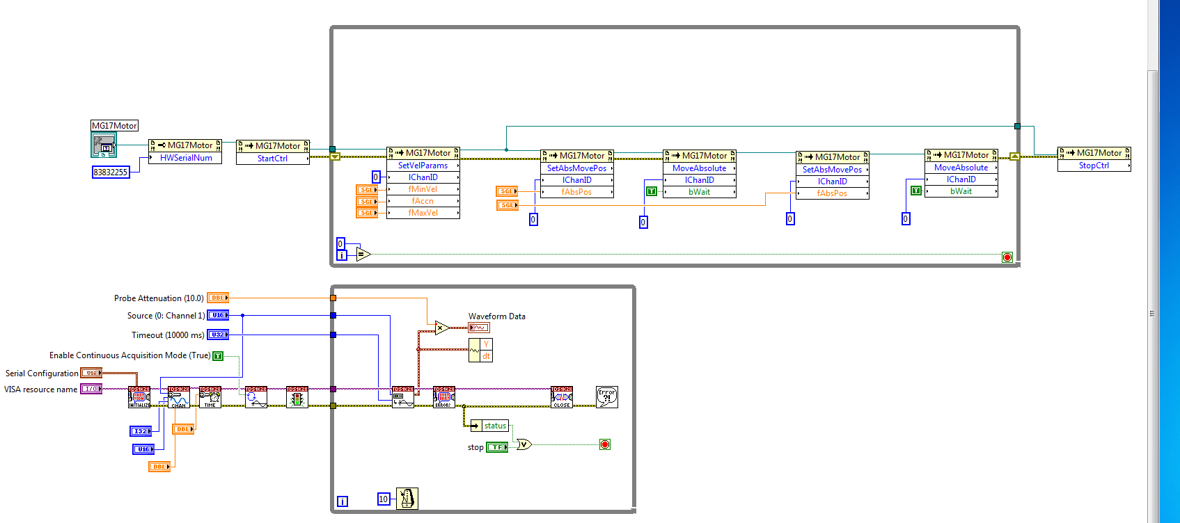 Das erste Program dient dem Auslesen eines Oszis. Das zweite Program dient dem Steuern eines Servomotors. Nun möchte ich diese beiden Unterprogramme in ein Program überführen, welches den Auslesestart des Oszis sowie den start des Motors zeitgleich ermöglicht. Dies ist bei allen Versuchen, die ich bisher unternommen habe Misslungen. Entweder startet der Motor oder das Auslesen des Oszis. Dies geschied aber nie simultan. Als relativ blutiger LV-Anfänger bin ich für jeden Lösungsvorschlag dankbar.