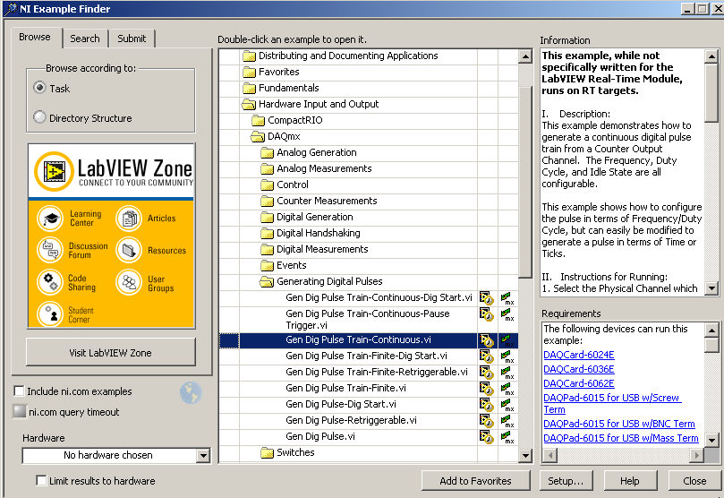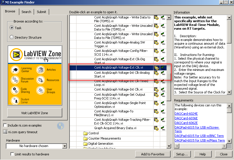 Und dann ist der NI-Examplefinder eine tolle Fundgrube für fast jede Art von DAQmx-Problem: