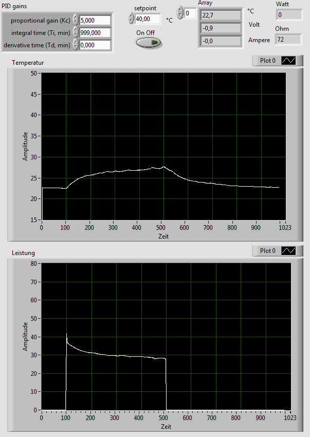 Ich würde jetzt noch schauen, ob ich durch Anpassungen an den Parametern (einfach mal ±20%) evtl. ein "besseres" Regelverhalten hinbekomme. Man könnte z.B. schneller als in 10s auf Solltemperatur sein und dann auch geringe Überschwinger in Kauf nehmen - ist aber auch eine Frage der Anforderungen…