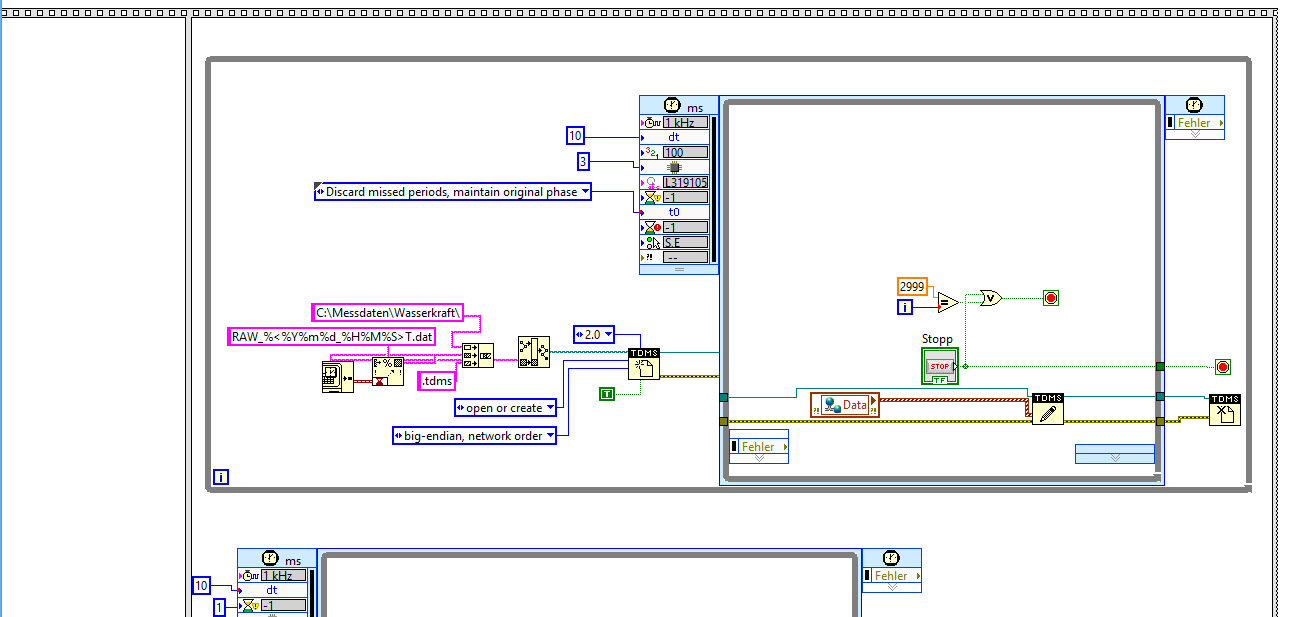 Untere Schleife: DAQmxRead wartet, bis die im Read-Eingang angegebene Zahl von Daten im Puffer ist. Nimm am besten 10 000 Werte, dann ist die Zeit zwischen zwei Schleifendurchläufen 10ms, alo genau wir vorher.