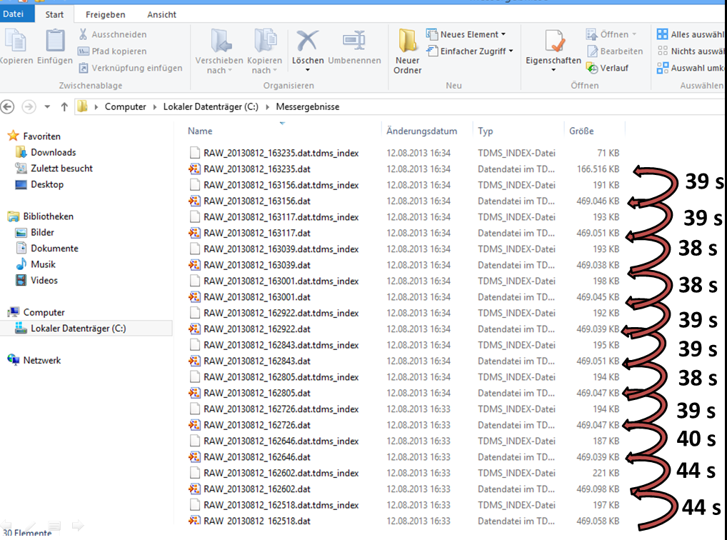 Ich habe noch ein weiteren Screenshot angefügt in dem man die gespeicherten TDMS-Dateien mit dem Zeitstempel in ihrem jeweiligen Namen sieht. Wie man sehen kann sind die Intervalle zwischen den Dateien weder 30 Sekunden noch konstant….