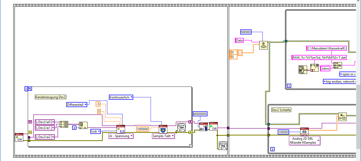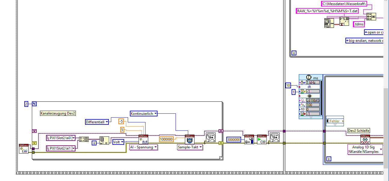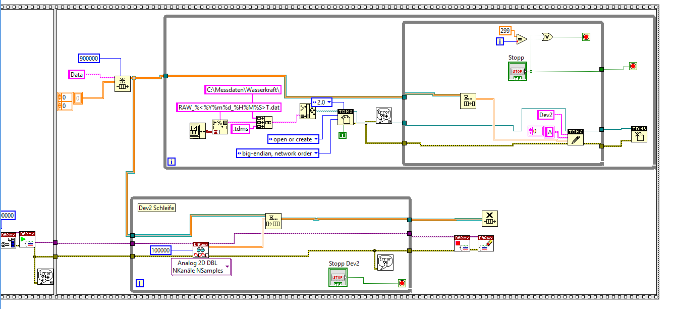 Untere Schleife: DAQmxRead wartet, bis die im Read-Eingang angegebene Zahl von Daten im Puffer ist. Nimm am besten 10 000 Werte, dann ist die Zeit zwischen zwei Schleifendurchläufen 10ms, alo genau wir vorher.