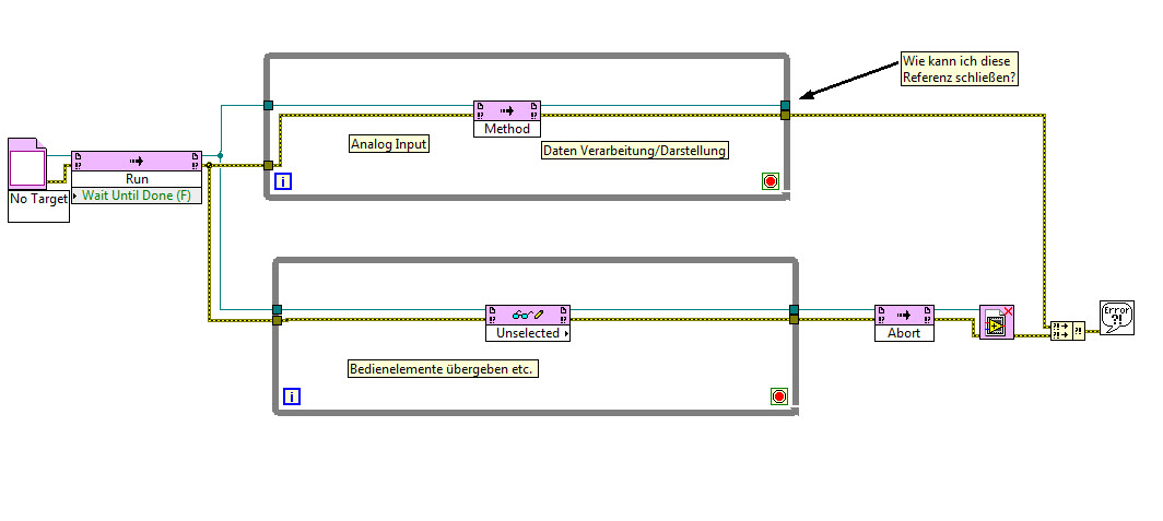 Im Anhang hab ich mal ein Bild angefügt als minimal Beispiel. Ich benutze zwei paralle Schleifen um in der einen Bedienelemente zu bedienen und eine andere in der ich Analoge Daten vom FPGA zum Host lese. Hierfür muss ich beide Schleifen mit der FPGA Referenz versorgen, nach beenden dieses VI bekomme ich nun immer eine Fehlermeldung das eine Referenz nicht geschlossen wurde. Die Möglichkeit die Referenzen zu verbinden (wie z.B. Merge Errors) habe ich leider nicht gefunden. Beide Referenzen mit dem VI Referenz schließen bringt auch eine Fehlermeldung, da für eins der beiden Referenz schließen VI´s die Referenz schon von der anderen geschlossen wurde.