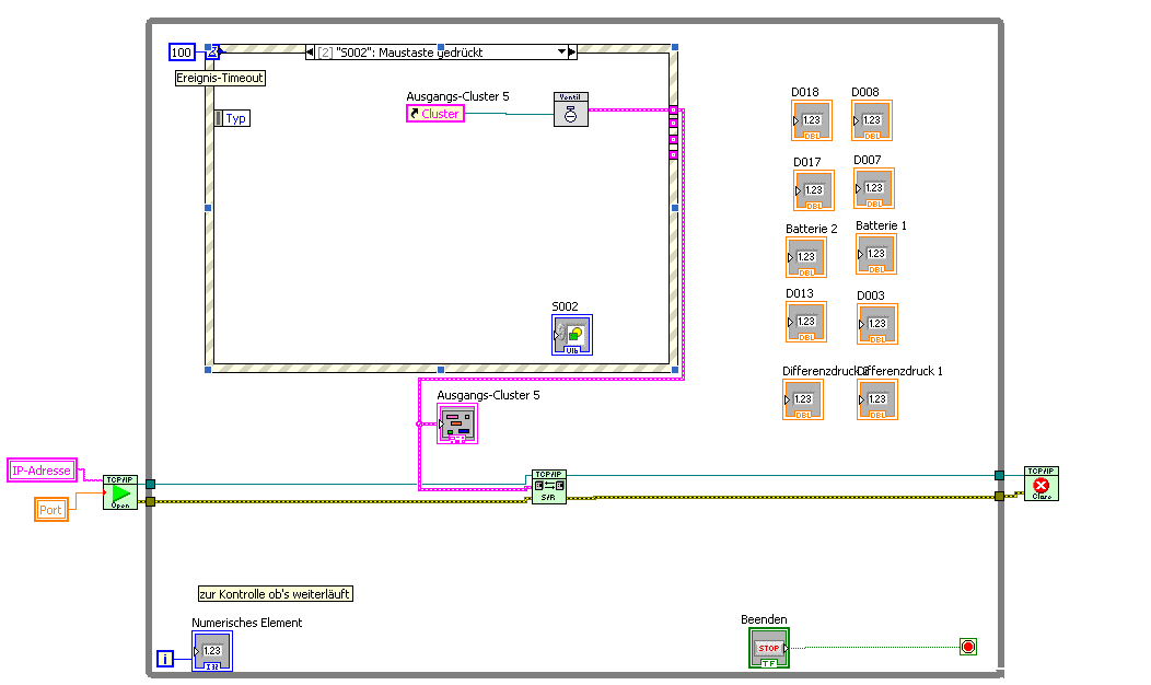Habe eine Case-Schleife, die das entsprechende SubVI mit Dialogmaske aufruft, sobald auf ein Ventil oder ähnliches geklickt wird und es wird ein Cluster aus dieser Schleife zu meinem KommunikationsVI herausgeführt.