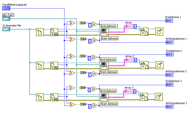 Leider muss ich dafür das File dreimal öffnen und schließen. Im angehängtem Bild wird die Idee exemplarisch dargestellt. Die drei Sub-VIs lesen das jeweils File von der gegebenen Start-Adresse bis zur jeweiligen End-Adresse Zeile für Zeile aus, ziehen die gewünschten Informationen und speichern diese jeweils in 3 Arrays (Array 1, Array 2 und Array 3).