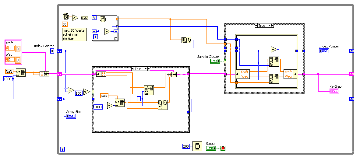 Da ich mehrere Werte setzen/auslesen muss, habe ich als Schieberegister den Cluster gewählt, auch wenn ein direktes Array-Schieberegister vermutlich schneller wäre.