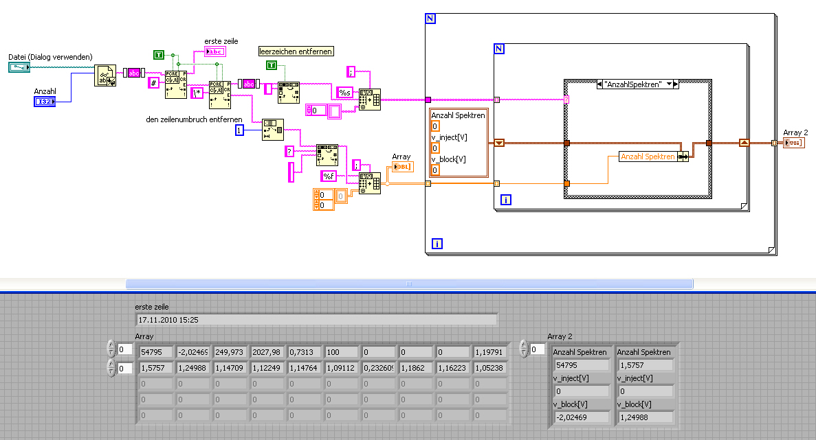 - am nächsten ";" splitten (dies wäre das nach den Spektrumswerte), per SpreadsheetstringToArray mit Trennzeichen "'" (Hochkomma) in ein Array of DBL umwandeln, in Cluster eintragen