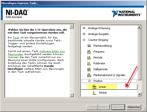 Wenn du mit DAQmx arbeitest, dann nimm den DAQmx-Assistenten und erstelle eine Positions-Messung mit einem Counter. Wenn du wissen willst, wie das genau programmiert wird, dann mach einen Rechtsklick auf das Express-VI und wähle "Frontpanel öffnen" aus. Dann kannst du das Express VI in ein Standard-VI konvertieren und dir den Quellcode anschauen.