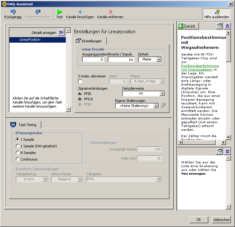 Die Screenshots zeigen einen DAQmx-Task für einen Linear-Encoder, der einen Weg von 1 mm pro Tic ausgibt ...