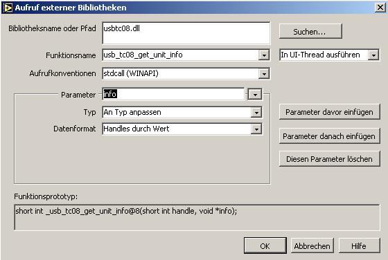 Import der Funktionen mit dem LV8.6-Dll-Assi geht hervorragend, sogar solche Aufrufe wie usb_tc08_get_unit_info werden importiert.