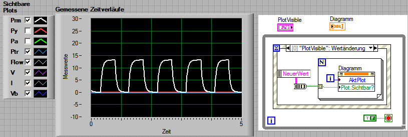 Mithilfe der Propertynodes Act(ive)Plot und Plot.Visible kann ich wie im Bild ausgeführt einzelne Traces/Kurven im Waveformgraph ausblenden. Leider habe ich noch keine Möglichkeit gefunden, auch die Plotlegende dahingehend zu beeinflussen, dass für nichtangezeigte Traces/Kurven auch der Eintrag in der Plotlegende dazu entfernt wird.