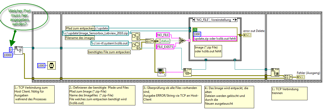 Das ganze ist ein Programm um das System von LV 2010 automatisch auf LV 2013 hoch zurüsten, das Zip-File enthält ein Image und soll auf dem sbRio entpackt werden. Die Daten werden dann nach und nach miteinander ausgetauscht. Mein Kollege meinte, dass dies bei LV2010 auf LV2012 schon funktioniert hat. Huh