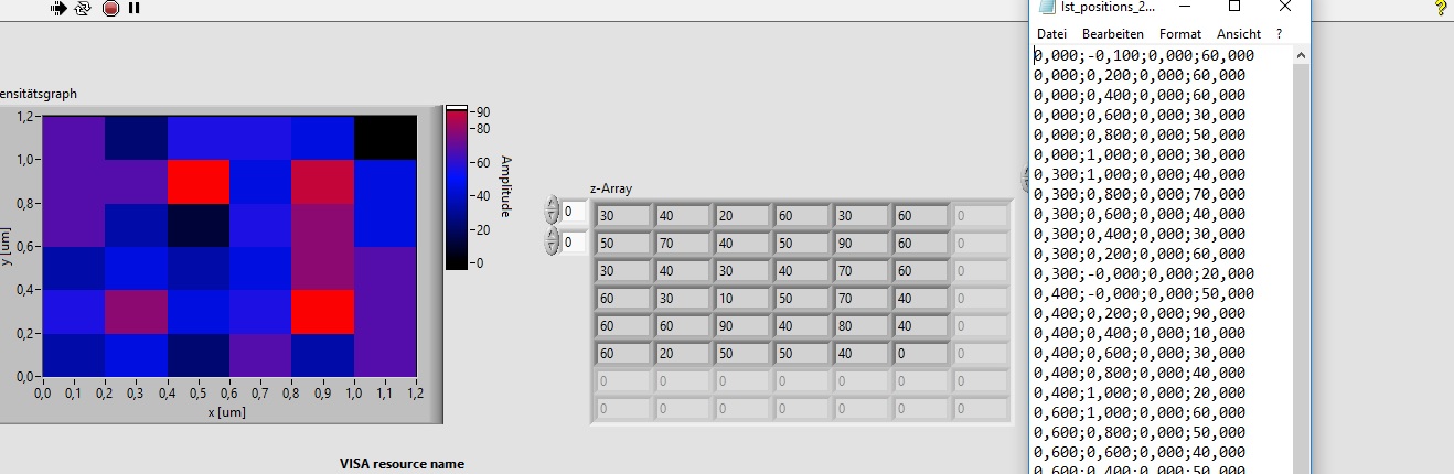 Was ich jetzt noch geändert habe, ist eine flache Sequenzstruktur in der inneren For-Loop. Im ersten Rahmen wird der Motor bewegt und etwas gewartet, dann werden im zweiten Rahmen die Positionen der Achsen und der Messwert (Zählrate) abgefragt, die dann in den dritten Rahmen übergehen, wo die Daten (Positionen und Messwert) dann einmal in die Tabelle geschrieben werden und die Messwerte an die richtige Stelle des Arrays geschrieben werden. So ist es zwar nicht zeitlich gemittelt. Aber so erhoffe ich mir, dass zumindest der gleiche Wert in Z-Array und ins CSV-File geschrieben werden, weil die Rahmen ja erst durchgeführt werden, wenn alle notwendigen Daten anliegen. Mache ich mir da zurecht Hoffnung?