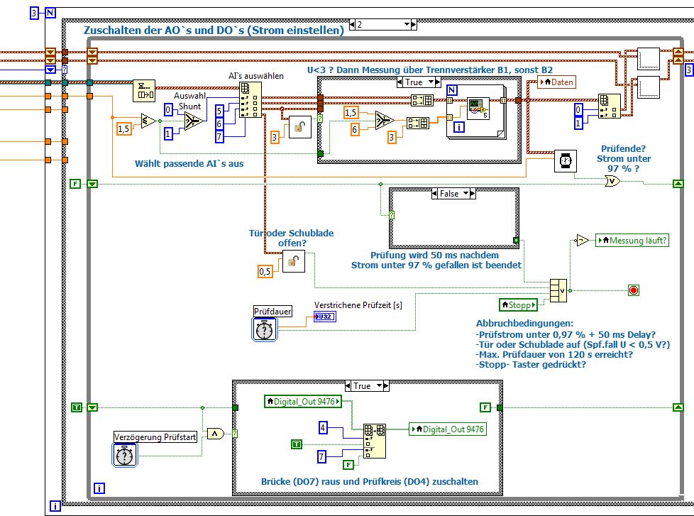 -In dem Prüfablauf soll nach einer kleinen wartezeit ein DO gesetzt und ein anderer nicht mehr gesetzt werden. Leider führt das programm diesen schritt nicht aus, da die prüfung bereits vorher unterbrochen wird. DIe Messung oben starten natürlich etwas vor der Prüfung, damit alle Messdaten ausgewertet werden können. Hat jemand eine Idee? (siehe Bild)