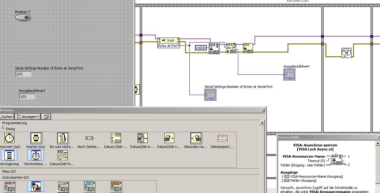 Ich empfange auf der Seriellen Schnittstelle (RS232) eine handvoll Bytes (270) und möchte diese in einem String weiterverarbeiten. Der Eigenschaftsknoten verrät mir dass wirklich 270 Bytes im Eingangspuffer liegen, das "Visa Lesen" Modul erfasst aber nur 103 (ermittelt durch Ausgabezählwert). Wie kommt das?! als Timeout habe ich 10k eingegeben.