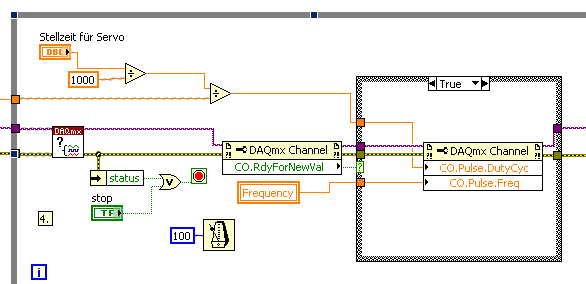 Das mit der Abfrage "Counter Ready" wird dann wichtig, wenn du mal eine Steuer-Schleife mit höheren Update-Raten hast. Es muss nämlich mindesten 1 DutyCycle mit aktuellen Werten erzeugt werden, bevor neue Werte gesetzt werden dürfen. Bei 50 Hz bedeutet das umgekehrt, dass du max. 50mal pro Sekunde einen neuen Werte setzen darfst. Momentan ist in der Schleife noch ein Wait mit 100ms drin, deshalb ist die Abfrage eigentlich überflüssig.