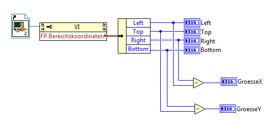 Zitat:Die Größe des FPs ermittle ich aus einer statischen VI-Referenz und einem Eigeschaftsknoten mit der Eigenschaft "FP-Bereichskoordinaten". Diese liefert die Koordinaten der linken oberen Ecken und der rechten unteren. Voneinander subtrahiert ergibt sich so die Größe.