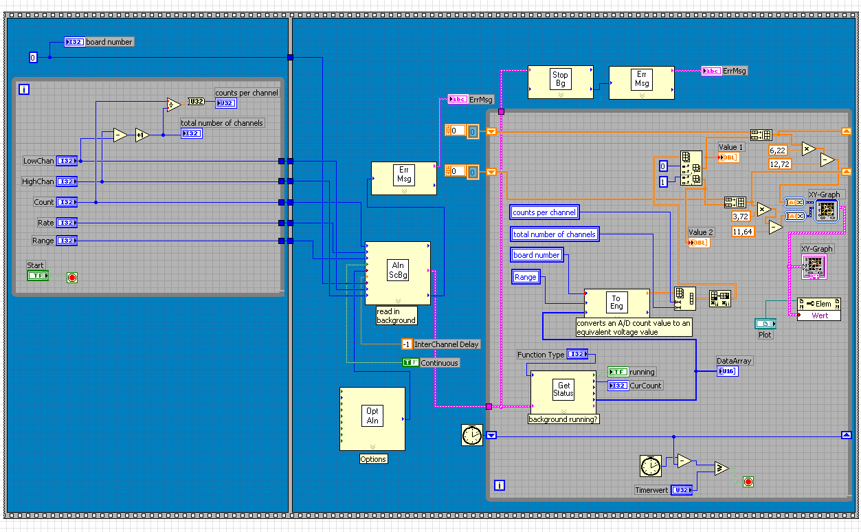 Wer hat dir nur beigebracht, im Blockdiagramm die Hintergrundfarbe zu verändern? Selbst "Normalsehende" haben da ja Probleme, blaue Drähte (Integerwerte) auf blauem Hintergrund zu erkennen! Ich habe ja nichts gegen eine Hervorhebung von relevanten Programmteilen, aber einfach nur Strukturen einfärben um des reinen Selbstzweckes wegen... Und hinterher bei der Dokumentation der Studienarbeit den Institutsfarbdrucker leer drucken