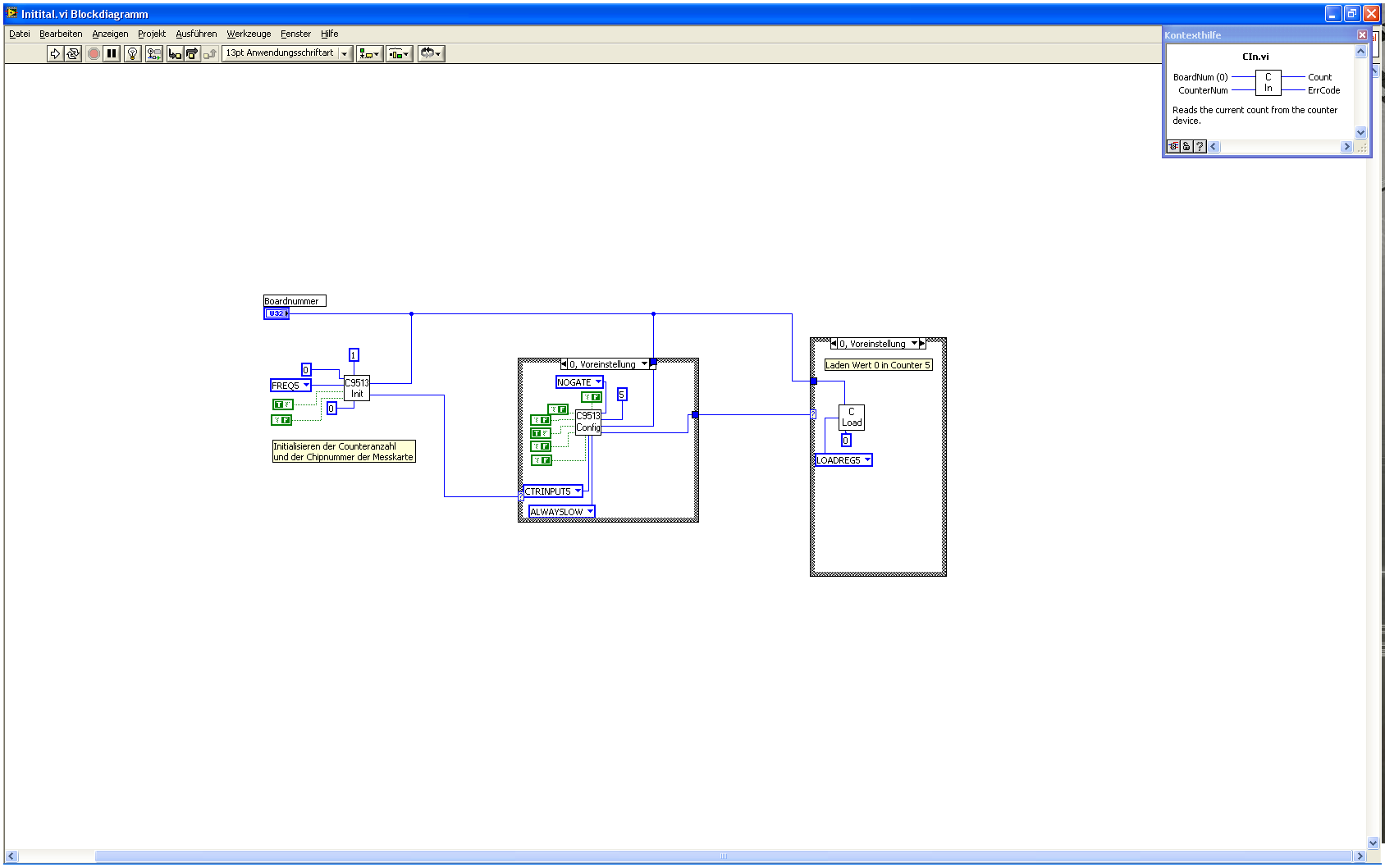 Mein Ziel ist Ereignisse zu detektieren und auszuwerten. Die Ereignisse werden von einer Gabellichtschranke erfasst und an die Messkarte (Measurement Computing USB 4301) übertragen. Jetzt zu meinem Problem: lese ich die Counter von einem definierten Startpunkt (zweite Lichtschranke mit genau einem periodischen Signal dient als Start / Endwert) bis zu einem ebenfalls definierten Endpunkt aus, variiert der Counterwert. Das heißt obwohl 24 Ereignisse vorhanden sind werden weniger erfasst manchmal auch 24. Die Ereignisse werden von der Lichtschranke noch richtig erfasst, das habe ich schon überprüft. Ich denke das es an meinem programm liegen könnte.