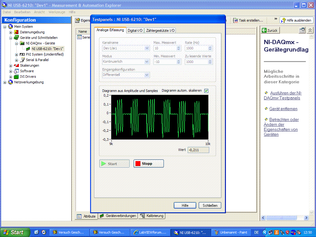 Da es im Komplettprogramm nicht funktioniert hat, hab ich das ganze mal in ein einzelnes VI gepackt und mir die Fehler angeschaut. Gleich nach dem Start kommt der Fehler im angehängten Bild. Das Signal ist allerdings auch mächtig komisch, siehe dem anderen anderen Bild.