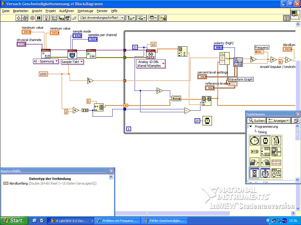 Zur Zeit hänge ich an der Bestimmung einer Fahrgeschwindigkeit. Ich nehme mit meinem NI Usb-6210 über die Analogeingänge ein Spannungssignal auf und möchte davon die Frequenz und das Tastverhältnis bestimmen.