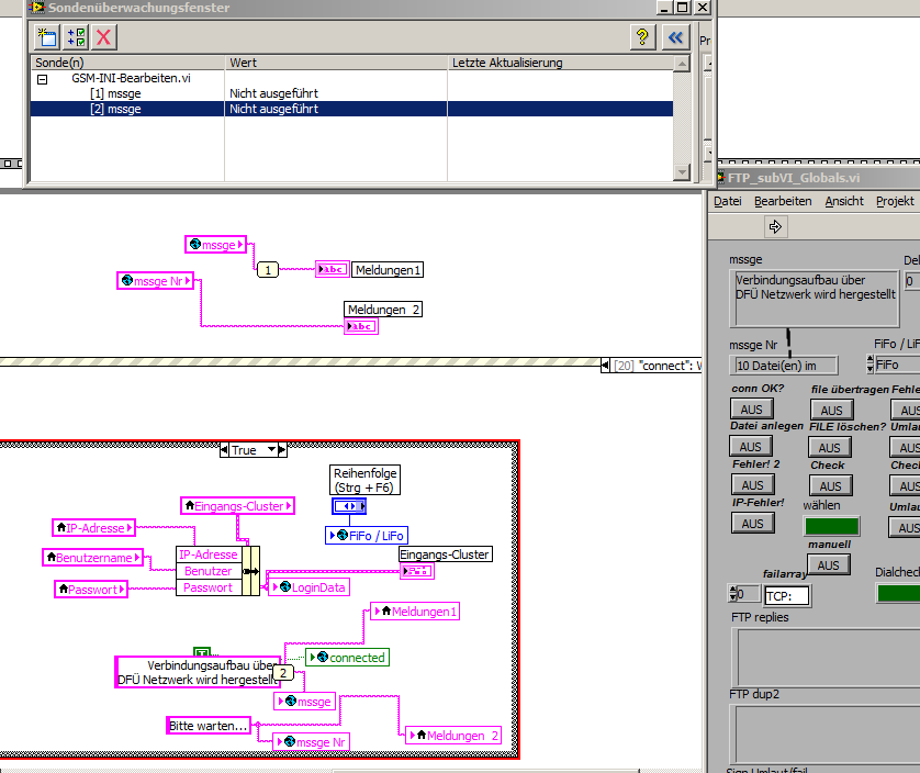 Also, das HauptVI läuft ständig, in dem werden die Meldungen, die zur Übersicht des Verbindungsstatuses dienen, angezeigt. Im Hintergrund wird noch ein SubVi gestartet. In dem subVi werden die Verbindungen aufgebaut und die Meldungen in der Abhängigkeit vom Fehler in den globalen Variablen geschrieben. Die globale Variable sind im HauptVI mit den Anzeigefenster verbunden. Die Meldungen sollen sich ständig ändern, aber das bleibt hängen!!!! Das HauptVI wird an der Stelle oben, da die zwei glb. Variablen sind, s. Anhang, nicht rechtzeitig oder gar nicht ausgeführt!!!!! Worum?? Ich komme nicht klar, was man an der Stelle ändern muss, damit die globale Variable ständig abgefragt werden und die Meldungen in der Anzeige erscheinen...