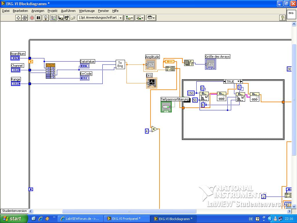 Ich habe auch am Anfang probiert, wie im obengenannten Posting das VI zur Datenerassung einzusetzen, das die erfassten Daten in Form eines Arrays ausgibt, bin dann leider derselben Problematik begegnet, und hab deshalb diese andere Alternative genommen, um erstmal weiterkommen zu können. Es hat bis jetzt eigentlich wunderbar funktioniert, nur das Array, in das ich die ganzen Daten einpacke, vergrößert sich halt die ganze Zeit, (hab auch deswegen eine Anzeige eingebaut, um die Größe des Arrays zu überwachen), und bei meiner Projektarbeit gehts darum, EKG-Signal kontinuierlich zu erfassen, d.h. wenns sein muss, wirds 24std lang aufgenommen, und das Array kann ja nicht beliebig groß werden. Ich habe schon seit längerem vergeblich nach einer Lösung gesucht, und hatte mir zwar auch so ne art Ringpuffer einzubauen überlegt, wusste aber nicht, wie ich das programmtechnisch auf LabVIEW realisieren soll. Ausserdem wollte ich gerne wissen, wie es bei den VIs von NI zur Datenerfassung aussieht, die die erfassten Daten direkt als Array ausgeben, vergrößert sich das Array auch ins unendliche oder hat es eine vordefinierte feste Größe?