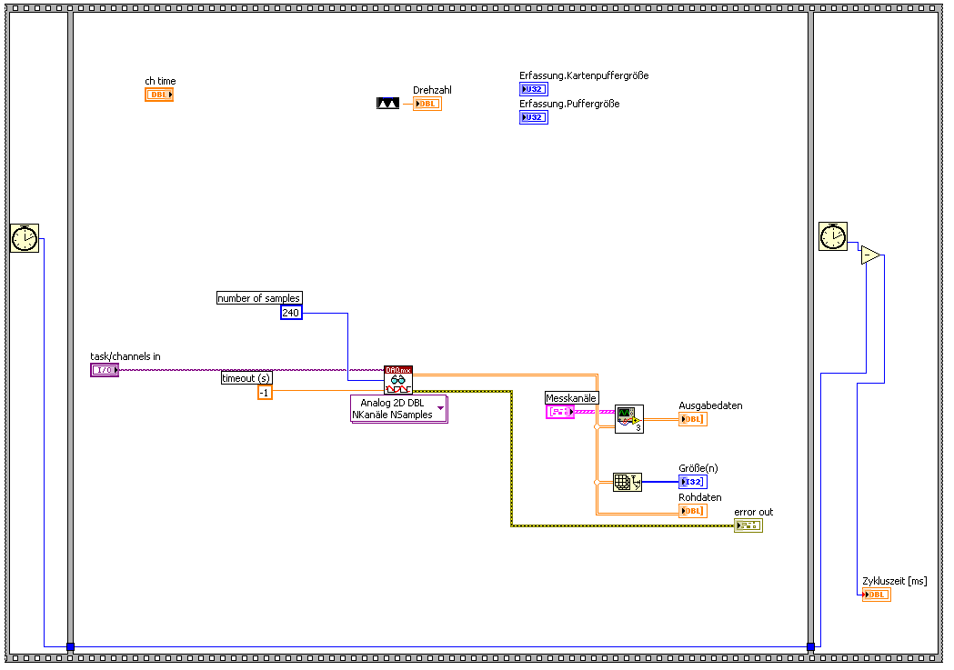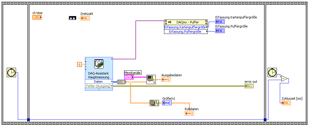 P.S.: Was ich bereits probiert habe: Ich habe den DAQ-Assistenten durch die entsprechenden einzelnen VIs ersetzt, um die Konfiguration vom eigentlichen Messen (read) zu trennen. So konnte das Auslesen an sich (ohne Konfiguration) allein in einer Schleife stehen -> leider gleich schlechte Durchlaufzeiten.